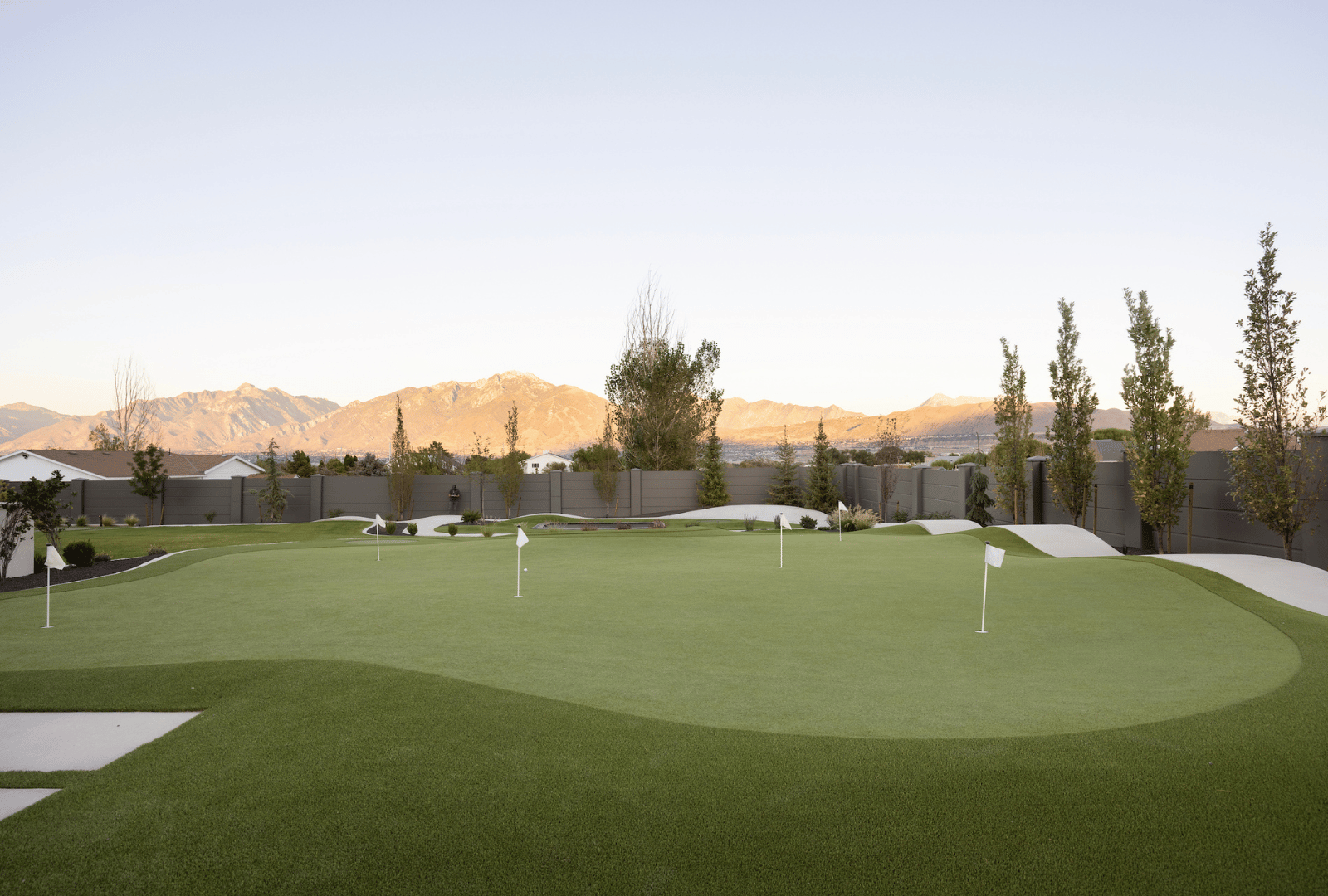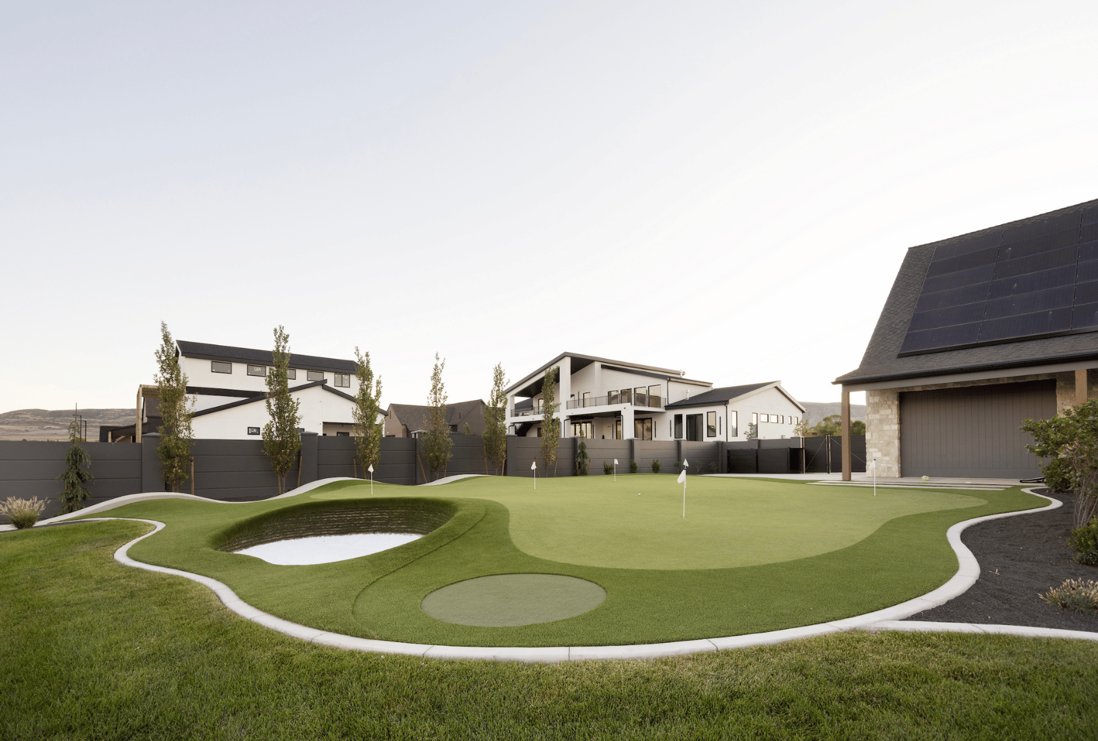 The surrounding landscape pairs artificial turf with concrete pathways, ornamental grasses, uplighting, and an in-ground trampoline surrounded by turf for a clean, finished look. Every zone of the yard serves a purpose, from practicing chip shots to evening entertaining to keeping the kids busy. Built to perform in Utah's climate.